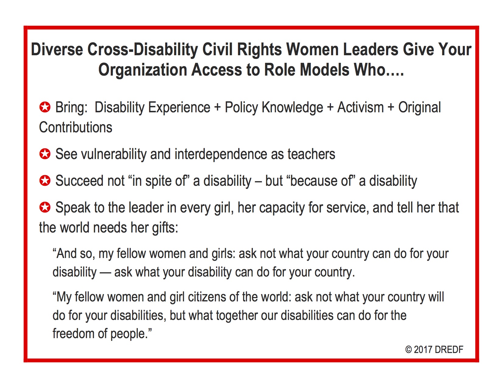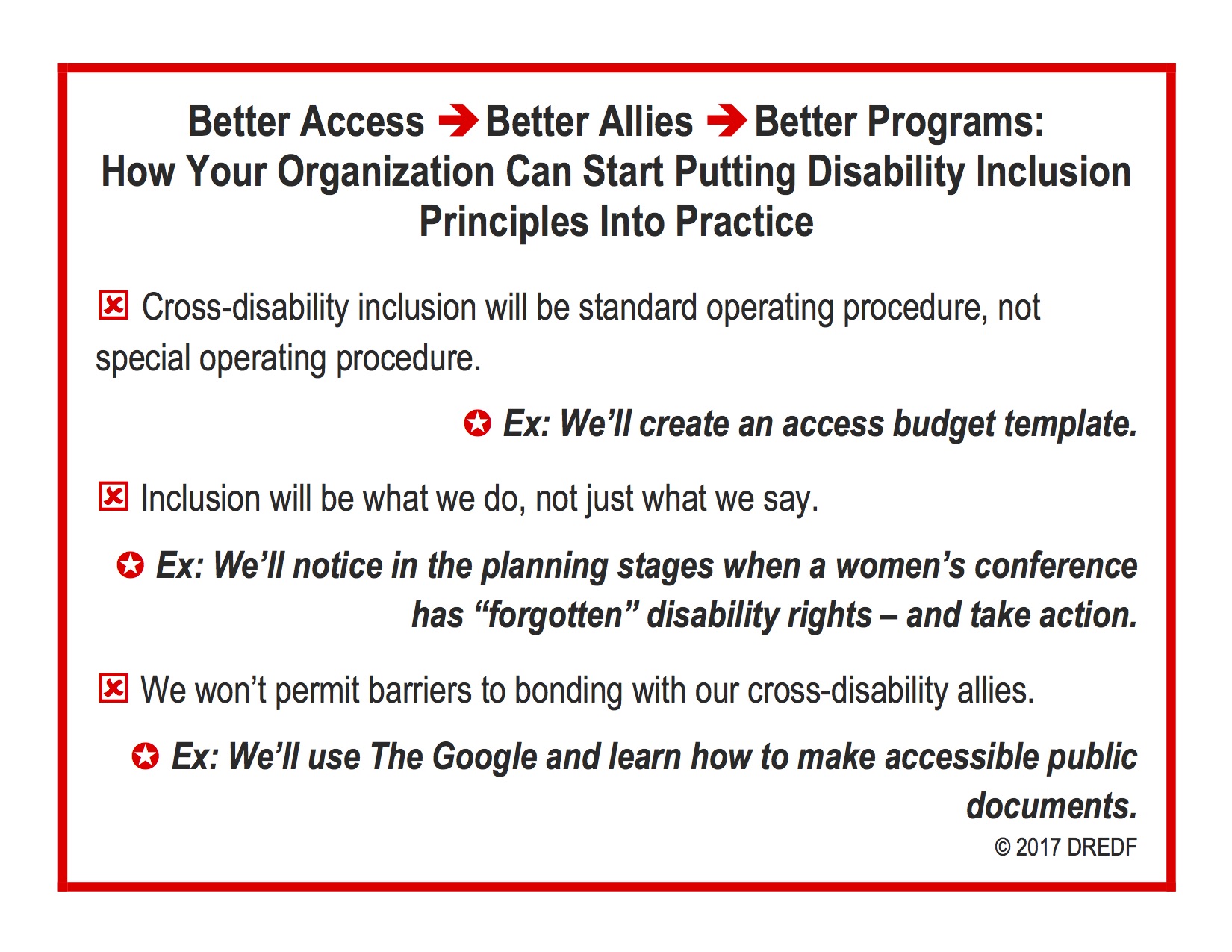 - Inclusive practices are more likely to continue and deepen over time because – to be blunt – the organizations will have the support and input of more and better cross-disability advocate allies when those allies recognize an organization that is worth their time. Not an organization that invites them to meetings where there are barriers. Not an organization that asks them to cross-promote inaccessible materials – or fix them. Not an organization that stays silent when women and girls with disability-related issues are missing from agendas, data, and projects.