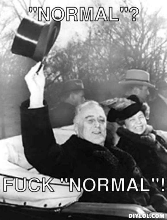 B/w photo of FDR and Eleanor Roosevelt in an open car. He is doffing a top hat. They are both grinning. Text reads "Fuck "Normal"!I get it — parts of my country suck. But it’s my country. I don’t think papering over rebranding Shitsylvania as Normylvania will change any of the painful — but authentic — feelings about my country.