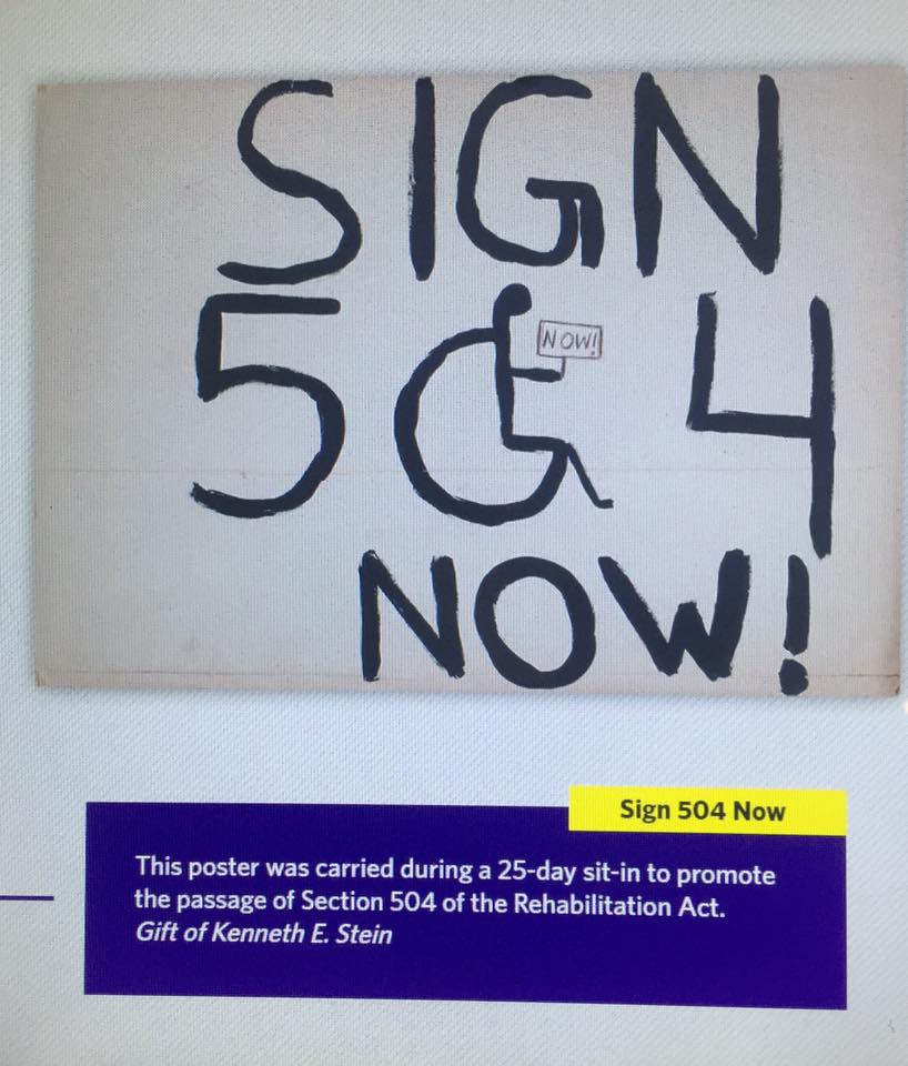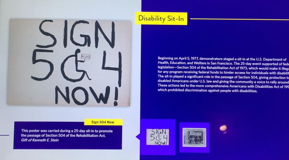 “Beginning on April 5, 1977, demonstrators staged a sit-in at the U.S. Department of Health, Education, and Welfare in San Francisco. The twenty-five day event [actually it was 26 days] supported of (sic) Federal legislation – The Rehabilitation Act of 1973 – which would make it illegal for any program receiving federal funds to hinder access to people with disabilities. The sit-in played a significant role in the passage of 504, giving protection to Disabled Americans under U.S. law and giving the community a voice to rally around. These actions led to the passage of the more comprehensive Americans With Disabilities Act of 1990, which prohibited discrimination against people with disabilities — at National Museum of American History. Photo courtesy Ken Stein