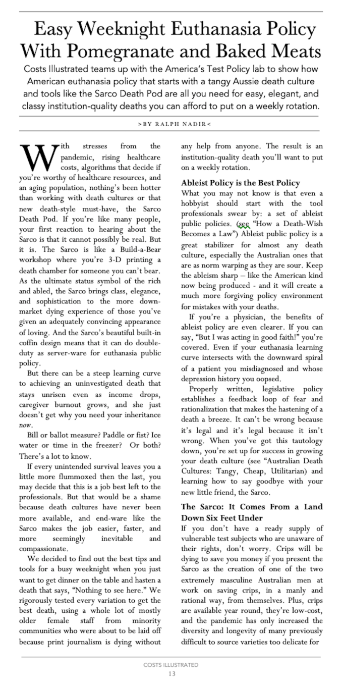 “All I had left to do was reposition my newly lifeless rival in the Sarco Death Pod (now available in Careless Whisper Red) as if she were a peaceful brisket nestled in a crock-pot, and it was set-it-and-forget-it time while plausible deniability downloaded into my beloved’s shattered consciousness.”