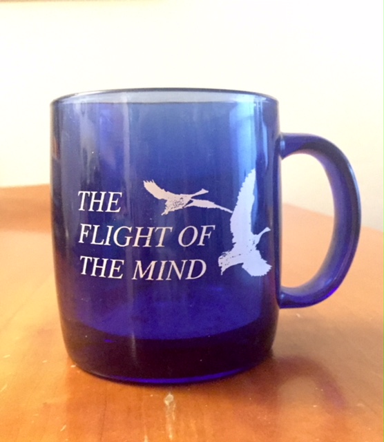 A beautiful translucent blue glass mug that says, “Flight Of The Mind” with two birds in flight. A tangible reminder of a women’s writing community Ursula Le Guin helped build.